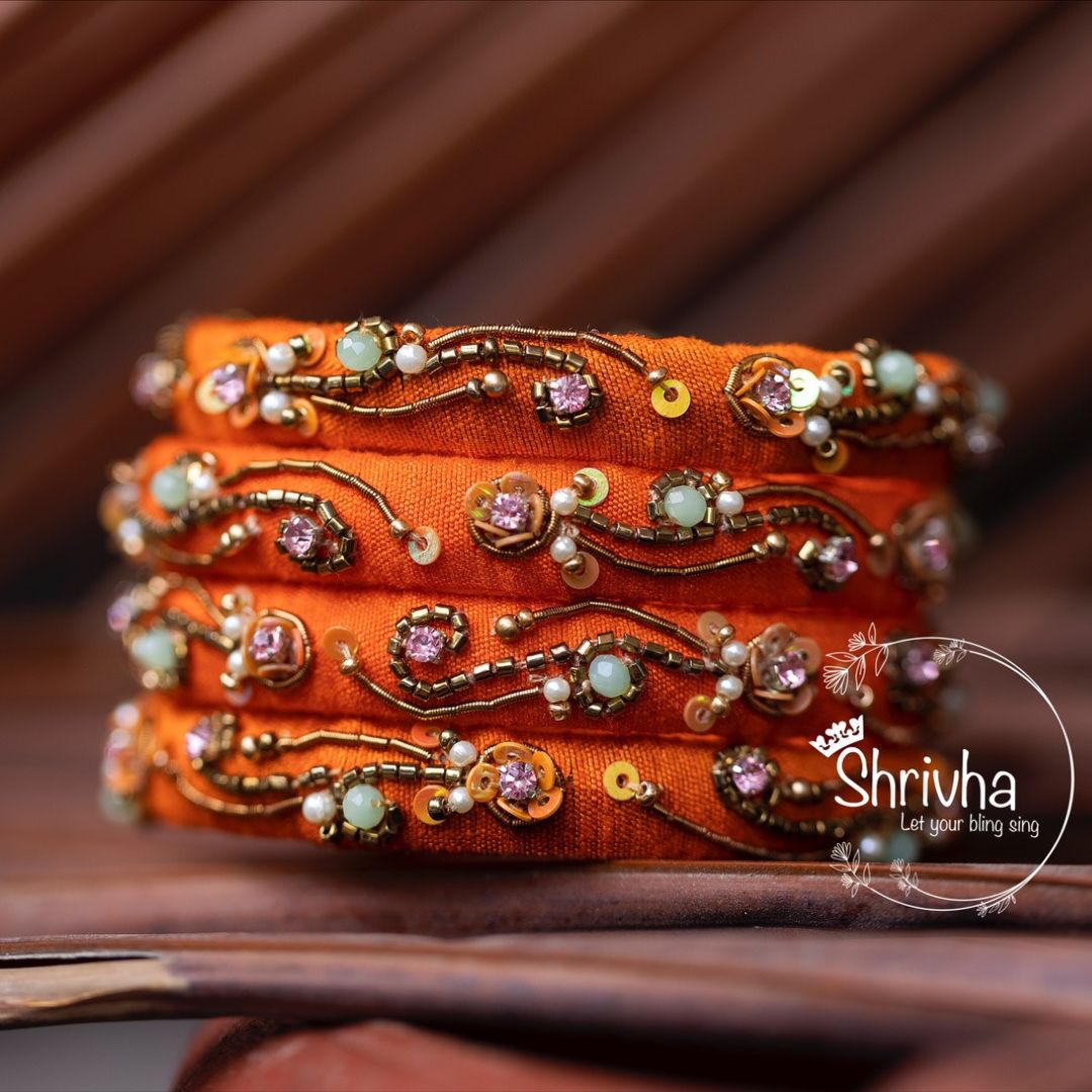 - The Autumn Rust Bangle Set, a symphony of rust-colored silk adorned with sparkling gems and delicate pearls, radiates the essence of autumnal elegance.