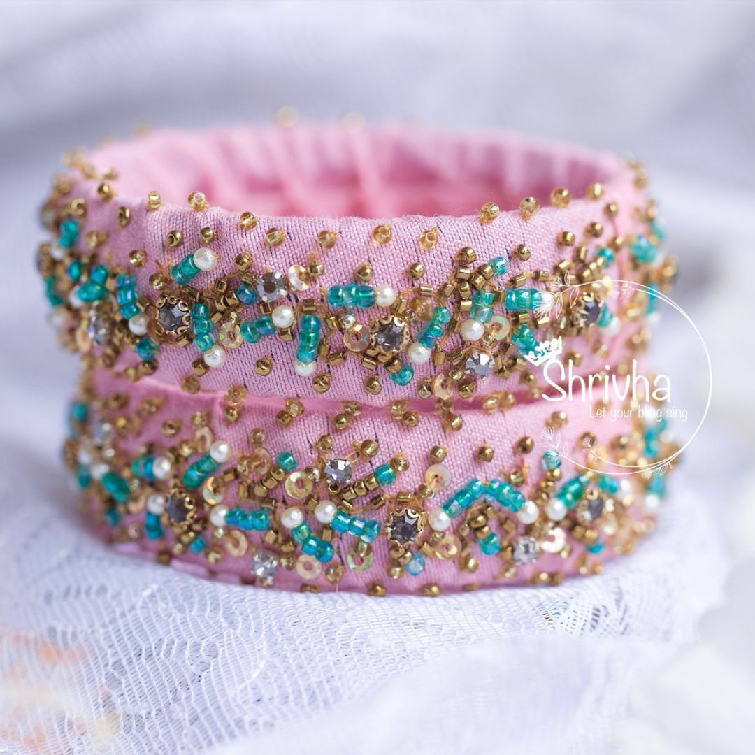 - Revel in the delicate artistry of the Blush Harmony bangle set, where raw silk meets the sparkle of sequins and the cool shimmer of aqua beads.